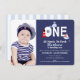 This boy's nautical 1st birthday party invitation features the word "one" in large letters surrounded by nautical elements, a whale, lighthouse, sail boat and helm. The background is navy blue and has a faint striped pattern. There is room for a photograph o n the side. This invitation is suitable as a boy's 1st birthday invitation and particularly suitable for a nautical theme birthday party.
