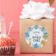 These "wild one" jungle safari themed boy's first birthday party stickers feature gold faux foil animals (giraffe, lion and monkeys), gold and blue jungle foliage, and a sprinkling of gold confetti on a pale blue background. Add the name of the birthday boy and other text in black.