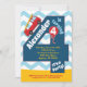 Cute boys 4th birthday invitation featuring blue and white chevron background, blue and yellow accents with red firetruck. For your little fireman birthday party.