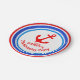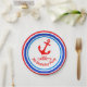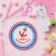 Bold anchor themed birthday personalised disposable paper plates, featuring your own name a red anchor graphic design. Personalise with your own birthday boys name and age. Currently reads Ahoy Danny's 7th Birthday Party. Ideal for a kids nautical birthday. Designed by Sarah Trett.
