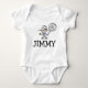 Baby name bodysuit with cute tennis cartoon. Sports T Shirt with personalizable cartoon print. Cute baby shower or 1st Birthday party gift idea for new baby boy. Personalised baby clothes for son, grandson, nephew etc. Custom jumpsuit with name of infants. Newborn body suits. Kid illustration with yellow ball and racket.
