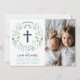 This elegant and stylish baptism, christening invitation features an illustrated floral wreath with the word "Baptism" encircling a cross. The right side of the card includes a customisable photo area. The text colour, font and message can be changed to your liking. The back of the invite features a navy background (that can be swapped to any colour of your choice) with a white quatrefoil pattern.