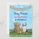Cute baby and teddy bear with baseball cap, baseball glove and baseball and bat sitting in the grass together by a baseball field. This is a cute theme for a boy's baby shower in the spring or summer.