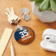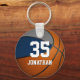 This boys' basketball keychain features a simple basketball graphic with his blue and grey school colours on two of the basketball's panels and easily customisable player name and large jersey number in a sporty, varsity letter style font - by katz_d_zynes