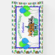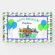 Cute hand drawn cartoon bear, fox and racoon Woodland animals boy's birthday banner, blue and green balloons.