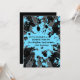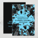 Cute 5x7 paintball birthday party invitations with blue and black paint splatters on a grungy grey, black, and blue sunburst patterned background. These are easy to customise.