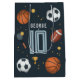 This cute and modern sports-themed kids birthday gift bag design features a blue sports cartoon design, with a basketball, football, soccer ball, tennis racket, trophy, and stars. The bag can be personalised with your boys name, and age. The perfect sports-themed addition to your child's party, perfect wrapping!