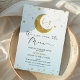 Sweet boys gold and blue moon themed baby shower invitation featuring a faux gold glitter moon, stars, and modern calligraphy text.