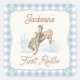 Sweet rodeo or western themed boy's birthday featuring a cowboy and horse, rope style font heading, rope frame and light blue buffalo plaid, or gingham pattern background. This first rodeo sticker also features a faint western desert landscape.