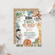 Cute boys safari or wild themed second birthday invitation featuring six jungle animals. The back of the invitation features a cheetah print pattern.