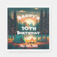 This camping birthday party napkin is set against a backdrop of towering trees and majestic mountains with a serene pond in the light of a setting sun. The image captures the tranquillity of the great outdoors, with shades of green and blue blending seamlessly to create a peaceful and inviting atmosphere. A bold, eye-catching font announces the celebration, inviting guests to join in on a birthday adventure under the stars. With its striking imagery and elegant design, this paper napkin promises an unforgettable experience surrounded by nature's majesty.
