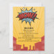 Yellow comic book birthday invitation with black lettering and wow on it. You can customise this item with birthday details of you own.