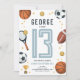 This cute and modern sports-themed kids birthday invitation design features a sports cartoon design, with a basketball, football, soccer ball, tennis racket, trophy, and stars. The invite can be personalised with your boys name and other details necessary for your party. The perfect sports-themed addition to your child's 13th birthday party (edit the design for alternative ages).