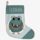 This cute and modern blue custom kids Christmas stocking design features a blue monster alien illustration. There is also space for you to add your boy's name in a simple and minimalist font. The perfect whimsical monster-themed gift for any magical creature enthusiast this holiday season!