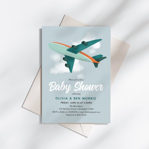This cute and trendy boys baby shower paper plate design features an aeroplane illustration with blue sky and clouds, and can be personalised with the parent's (or child's) names. The perfect travel- themed gift for your co-ed couples baby shower.