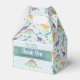 This cute and whimsical blue boys baby shower favour box features a dinosaur cartoon pattern, with a t-rex, stegosaurus and jurassic jungle plants, and can be personalised with the parent's names and a short thank you message. The perfect dinosaur themed personalised favour box for your co-ed couples boys baby shower.