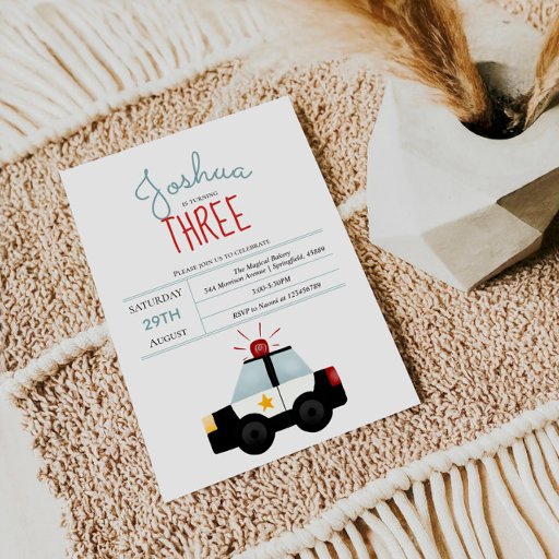 This cute and modern boy's birthday napkin design features a police car cartoon, with a matching blue police pattern around the edges, and can be personalised with your boys name. The perfect police-themed addition to your toddler's birthday.