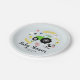 This cute and modern boys baby shower paper plate design features farm animal cartoons, with a green tractor, cows, pigs, sheep, chickens, and flowers, and can be personalised with the parent's (or child's) names. The perfect farm-themed gift for your co-ed couple's baby shower or kids first birthday.