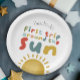 This cute and modern boys 1st birthday paper plate design features a sun illustration, with the text ‘first trip around the sun’ in colourful typography, and can be personalised with your boys name. The perfect bright design for your little one's first birthday!