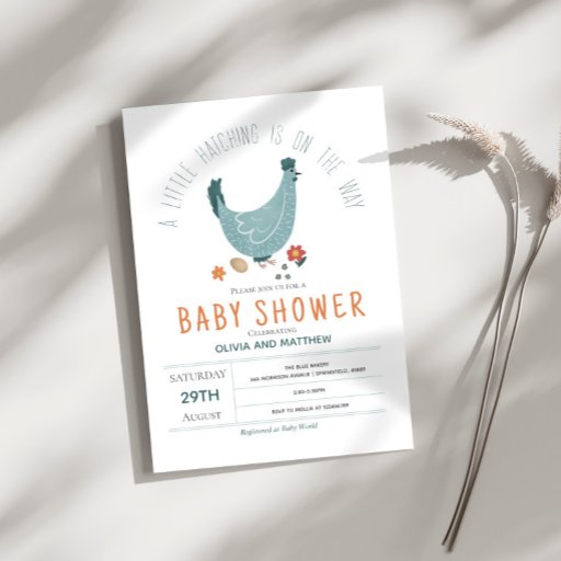 This cute, whimsical and modern boys baby shower invitation design features a cute farm chicken illustration, with a blue hen, flowers and an egg. The invitation features the words “a little hatching is on the way” and a simple white background, and can be customised with the parent's names and other details necessary for your party. The perfect spring-themed addition to your co-ed couples boys baby shower. Coordinating products available.