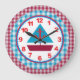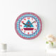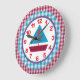 A handsome clock that can be proudly displayed in any young boys room. The outer edges of the clock are done in red and blue gingham. The inner face, with it's red and blue sailboat, is bordered in red and blue with blue minute markers. The numbers are bright and bold in a coordinating red.