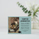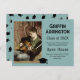 Guy grad, photo graduation postcard with mail-to address template on reverse. Teal colour and tan printed text - grad's name is in large script lettering at top. Invite to an "open house" or "Grad party", with place for school name and subject major / degree.