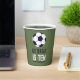 These cool and modern soccer-themed kids paper cups feature a vibrant green background with playful illustrations of a football (soccer ball). Personalize the text to suit any age/date/name. Perfect for boys’ soccer birthday parties!