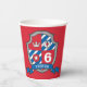 Personalise these mediaeval crest shield birthday party paper cups with your own birthday boys name. Ideal for using at a knights mediaeval themed kids birthday party. Boys version with a bird of prey style eagle head, star, crown age and name in grey, red, white and blue. © Original graphic art and design by Sarah Trett. www.mylittleeden.com