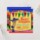 Fiesta baby shower invitation with cute baby boy wearing a dark blue sombrero on a festive multi colour serape background. These adorable Mexican Fiesta baby shower invitations are easily customised for your event by simply adding your details.