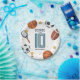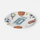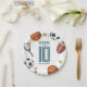 This cute and modern sports-themed kids birthday paper plate design features a sports cartoon design, with a basketball, football, soccer ball, tennis racket, trophy, and stars. The plate can be personalised with your boys name, age, and date of the party. The perfect sports-themed addition to your child's party.