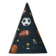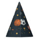 This cute and modern sports-themed kids birthday hat party design features a blue sports cartoon design, with a basketball, football, soccer ball, tennis racket, trophy, and stars. The hat can be personalised with your boys name, age, and date of the party. The perfect sports-themed addition to your child's party.