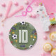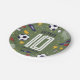 This cute and modern soccer-themed kids party plate features a vibrant green background with playful illustrations of a football (soccer ball), trophies, stars, goals, and soccer boots. Personalize the text to suit any age. Perfect for boys’ soccer parties!