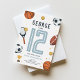 This cute and modern sports-themed kids gold foil birthday invitation design features a sports cartoon design, with a basketball, football, soccer ball, tennis racket, trophy, and golden stars. The invite can be personalised with your boys name and other details necessary for your party. The perfect sports-themed addition to your child's 12th birthday party (edit the design for alternative ages).
