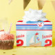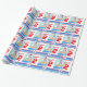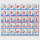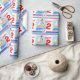 Birthday wrapping paper featuring little wooden boat with sail and flag on a windy day at sea in blue and red with stripes and a anchor. Personalise this whimsical boys birthday paper with your name and age. Currently reads Jamie 2 today. Uniquely painted in watercolor and designed by Sarah Trett.
