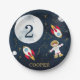 This personalized cute boy's outer space birthday party paper plate features a moon, astronaut, some space-ships and faux gold glitter stars and constellations.