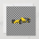 Colourful boy's birthday party invitation, done in a black and white chequerboard pattern, with a turquoise square text area. Graphics of a yellow and a red formula race cars decorate the bottom right corner. Text in red and black is fully customisable and ready to personalise for your son's big day.