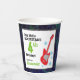 This boy's birthday party paper cup features a cute rockstar theme. The background border is a dark blue, green and black grunge and is accented with a red guitar and blue stars. This paper cup can be used for any age.