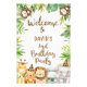 Cute safari themed two wild second birthday welcome sign featuring seven watercolor jungle animals, leopard or cheetah print pattern text and some foliage. This boys safari birthday welcome sign is ideal for a jungle themed birthday party for a boy.