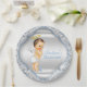 Angel baptism paper plates with adorable angel baby boy on a beautiful blue and silver swirl background. You can add the text of your choice to personalise these sweet baby boy baptism paper plates.