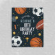 This cool and modern sports-themed kids birthday welcome sign design features a blue sports cartoon design, with a basketball, football, soccer ball, tennis racket, trophy, and stars. The poster or printable can be personalised with your boys name, age, and date of the party. The perfect sports-themed addition to your child's party, perfect for a 10th birthday.