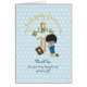 Personalised Boy's First Holy Communion Thank You card featuring a pretty floral cross, young boy in his first holy communion outfit, suit with a Bible praying with his rosary beads. There are text fields for you to add your own commemorative text. This is a lovely card of thanks to Godparents, Grandparent, Godmother or Godfather, friends, family on your son's first Holy Communion. This card is available with a range of caricatures featuring boys with different hair colours and skin tones. Access the full collection to see them all.