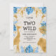 This "two wild" jungle safari themed boy's second birthday party invitation features gold faux foil animals (giraffe, lion and monkeys), gold and blue jungle foliage, and a sprinkling of gold confetti on an ecru background. Add the name of the birthday boy and party details in black text. A coordinating frame pattern of blue and gold leaves appears on the reverse.