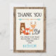 Cute thank you card featuring four cute woodland animals, a bear, racoon, deer and fox. The back of the card features an arrow and woodland animals pattern. This is a sweet way to thank your little boy's guests for coming to his birthday party. Sames design birthday invitation is also available.