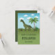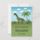 Destei's original cute cartoon illustration of a cute green colour Brachiosaurus dinosaur standing in a tropical world including a palm tree, some plants and green grass. The sky is blue with some clouds on it. There are also three personalizable text areas.