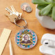 The original artwork by ZoeSPEAK on this Keychain features a portrait of the classical music composer Johannes Brahms, in an ornate golden frame, on a light blue wallpaper background with pink stripes and prancing white sheep. This is the keychaint for a classical music lover.