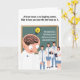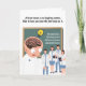 A graphic illustration featuring a cartoon professor with his brain visible in his head having a light bulb idea while brainstorming how to tackle a brain tumour operation on a patient. The neurosurgeons and physicians are standing in a lecture room with a blackboard behind them on which the names of the four most common tumours appear. The words, a brain tumour is no laughing matter. Glad to hear you have the best team on it, appears on the outside and the inside has your own personalised message to convey your heartfelt sympathy and recovery wishes to a friend, loved one or work colleague.
