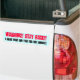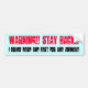 A bumper sticker that warns people that you will stop if there is an animal in the road near you. Red warning and stay back, black other words.
