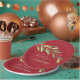 Paper plates in 2 sizes feature elegant greenery and berries with your message in chic lettering in any colour (we show gold) and on any colour background (we show red.) MATCHING items in our store.