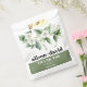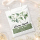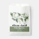 This floral wedding favour bag showcases a beautiful branch adorned with delicate white flowers and lush greenery. The couple's names are prominently displayed in bold typography, adding a personal touch to the design. A heartfelt 'Thank You' message is also included, making it a thoughtful token of appreciation for guests. Additionally, a stylish sage green band at the bottom ties the whole look together, creating a cohesive and elegant aesthetic for the special occasion.