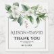 This elegant wedding wine label showcases a branch with white flowers and sage green leaves. The couple's names are displayed in decorative typography. A message of 'Thank You' is also included, expressing gratitude to the guests. Completing the look, a black thin border is around it.